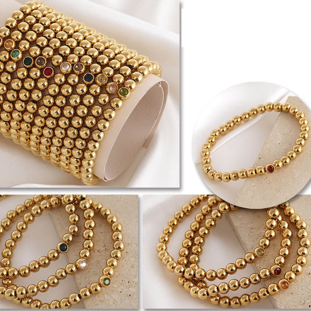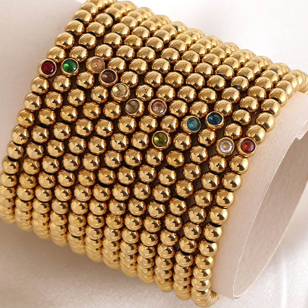 Stainless Steel Beaded Inlaid Glass Birthstone Gold Bracelet - Plated Smooth Metal Ball Bracelet